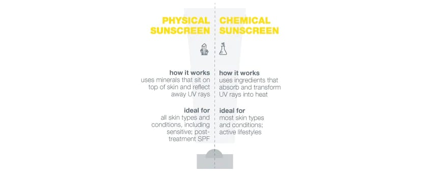 2 temel çeşit güneş koruyucu vardır: fiziksel ve kimyasal. Bunların her ikisinin de temel önceliği ve faydası cildi UV ışınlarından korumaktır.